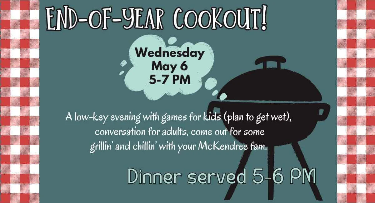 Come out and join us for our last Wednesday Night of this school year! Ring in the summer with your church friends at the McKendree UMC Cookout.