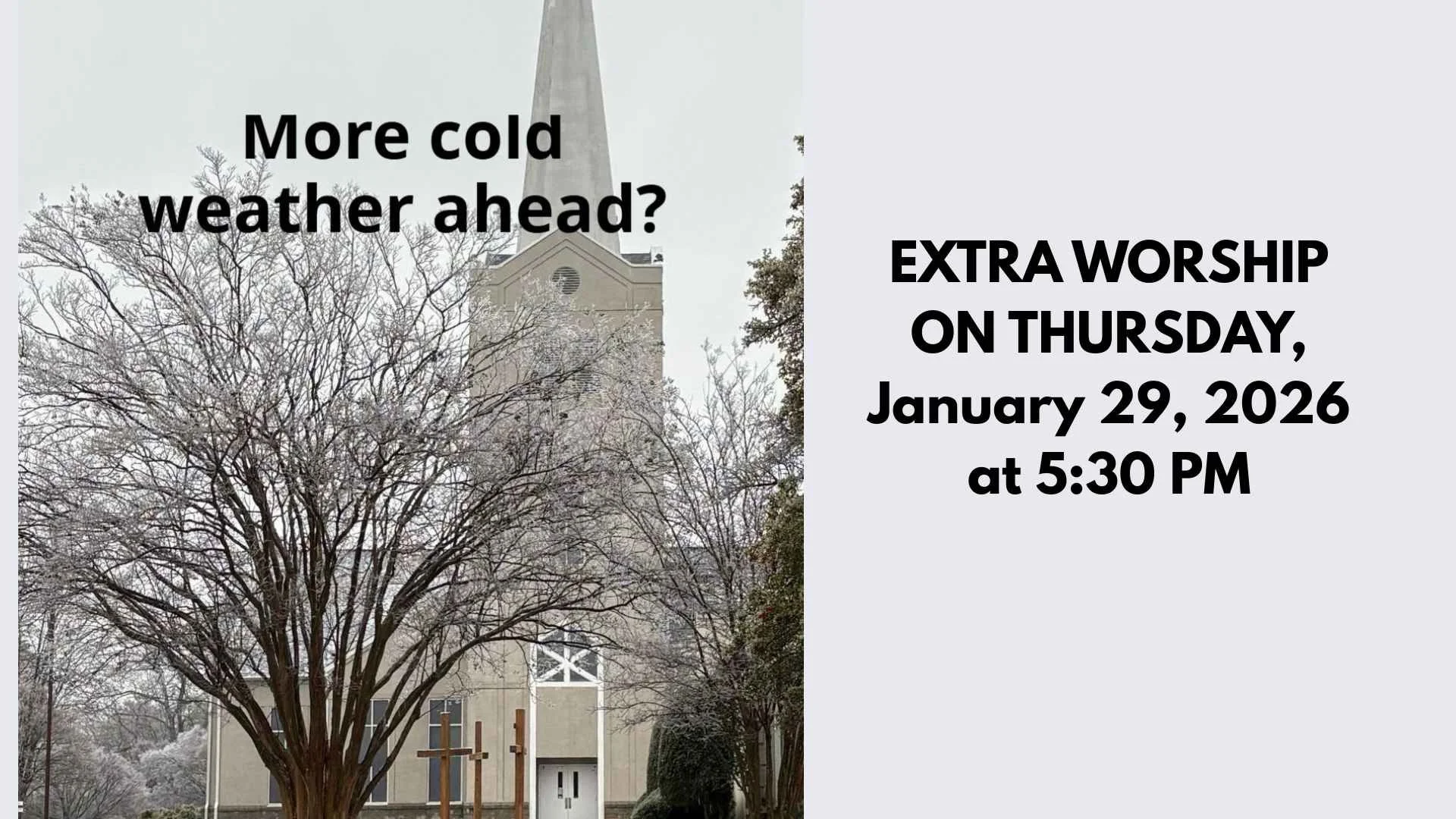 EXTRA WORSHIP ON THURSDAY Because the weekend forecast includes snow, an additional worship service will be offered on Thursday at 5:30 PM. This service creates space for those who want to worship and prefer not to drive on Sunday. Children are welcome and are invited to bring a quiet toy and sit near the front. Afterward, anyone who wishes can head to Taco Mac for conversation and a relaxed evening together.